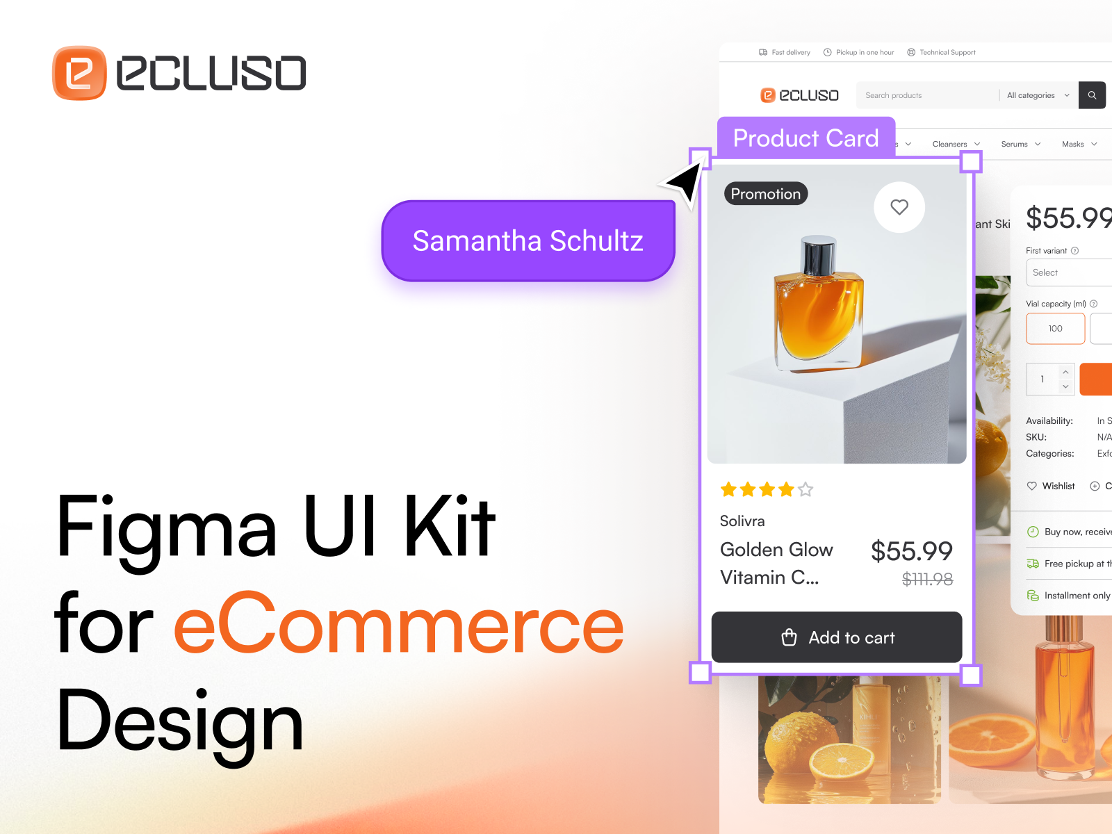 Comprehensive Figma UI Kit and design system for e-commerce, including pre-built sections, components, styles, and typography to speed up your design.By purchasing this product, you agree to the Ecluso UI Kit License.License (open in new tab): https://ecluso.com/license